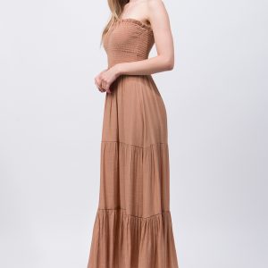 A ribbed-knit maxi dress featuring a v-neckline with shirred details, sleeveless, side cutouts, side slit, and solid color.