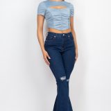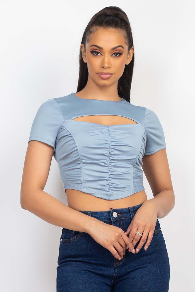 A knit top in a solid color featuring a round neckline, front cutout, short sleeves, ruching details, and a cropped hem